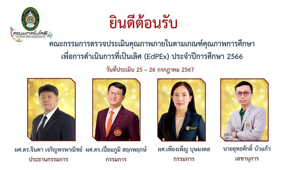 26 ก.ค. 67 รศ.ดร.สุนทร สุทธิบาก คณบดีคณะเทคโนโลยี นำผู้บริหารและบุคลากร รับการตรวจประเมินคุณภาพภายใน ปีการศึกษา 2566 ตามเกณฑ์คุณภาพการศึกษาเพื่อการดำเนินการที่เป็นเลิศ (Education Criteria for Performance Excellence :EdPEx) คณะกรรมการ ประกอบด้วย
