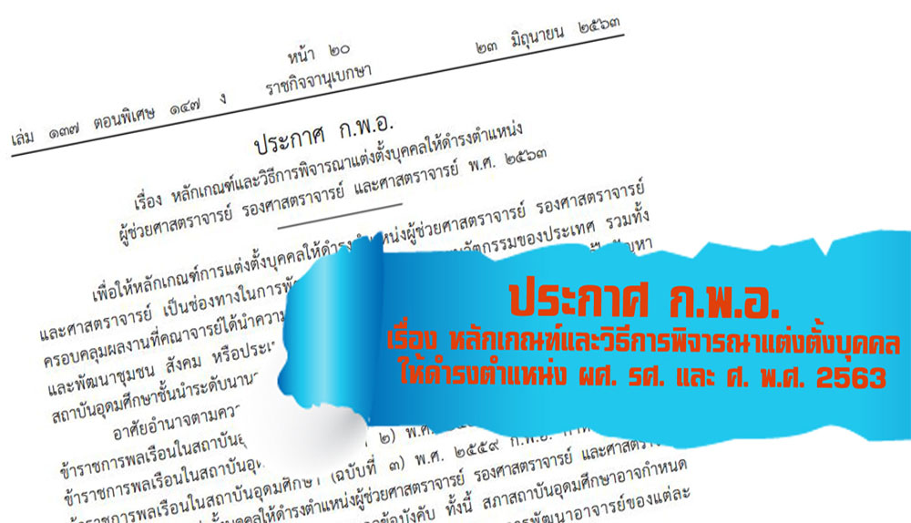 เมื่อวันที่ 23 มิถุนายน 2563 เว็บไซต์ราชกิจจาเผยแพร่ประกาศ ก.พ.อ. เรื่อง หลักเกณฑ์และวิธีการพิจารณาแต่งตั้งบคคลให้ดำรงตำแหน่ง ผู้ช่วยศาสตราจารย์ รองศาสตราจารย์ และศาสตราจารย์ พ.ศ.2563 เพื่อให้หลักเกณ์การแต่งตั้งบุคคลให้ดำรงตำแหน่งผู้ช่วยศาสตราจารย์ รองศาสตราจารย์ และศาสตราจารย์ เป็นช่องทางในการพัฒนาคุณภาพวิชาการและนวัตกรรมของประเทศ รวมทั้งครอบคลุมผลงานที่คณาจารย์ได้นำความรู้ความเชี่ยวชาญในสาขาวิชาของตนมาใช้ในการแก้ไขปัญหาและพัฒนาชุมชน สังคม หรือประเทศ ตลอดจนผลักดันให้สถาบันอุดมศึกษาไทยก้าวสู่ความเป็นสถาบันอุดมศึกษาชั้นนำระดับนานาชาติและเพิ่มขีดความสามารถในการแข่งขันของประเทศ.