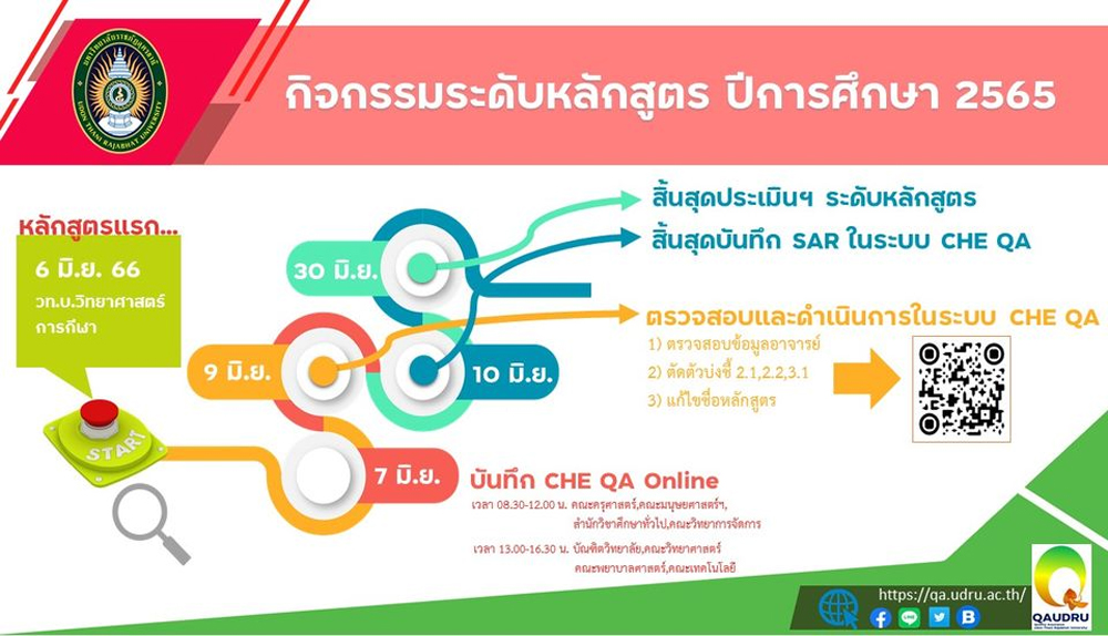 การประเมินคุณภาพการศึกษาภายใน ระดับหลักสูตร ปีการศึกษา 2565 เป็นกิจกรรมหนึ่งในระบบบและกลไกการประกันคุณภาพการศึกษาภายใน มหาวิทยาลัยราชภัฏอุดรธานี ที่แสดงให้สาธารณชนมั่นใจว่าบุตรหลาน ท่านที่เรียนในหลักสูตรต่าง ๆ ที่มหาวิทยาลัยจัดขึ้นมี "คุณภาพ"