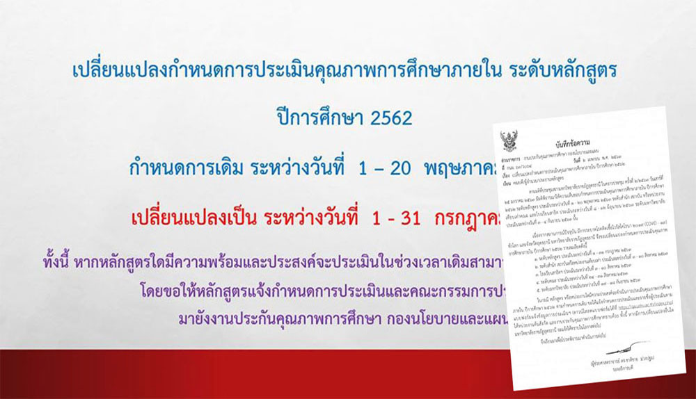 เปลี่ยนกำหนดการประเมินคุณภาพการศึกษาภายใน ระดับหลักสูตร ปีการศึกษา 2562