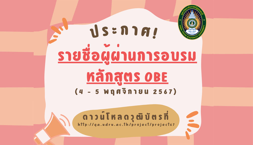 การอบรมโครงการประกันคุณภาพการศึกษา ประจำปีการศึกษา 2567 หลักสูตร OBE เมื่อวันที่ 4-5 พฤศจิกายนที่ผ่าน งานประกันคุณภาพการศึกษา โดย นางฐานิดา แก้วปาน หัวหน้างานประกันคุณภาพการศึกษาได้นำเสนอข้อมูลตามเงื่อนไขที่กำหนดเสนอผู้บริหารพิจารณาอย่างรอบด้าน จึงขอประกาศรายชื่อผู้ผ่านการอบรมโครงการดังกล่าว ผู้เข้าร่วมสามารถตรวจสอบรายชื่อ และดาวน์โหลดวุฒิบัตรได้ที่ http://qa.udru.ac.th/project/project67