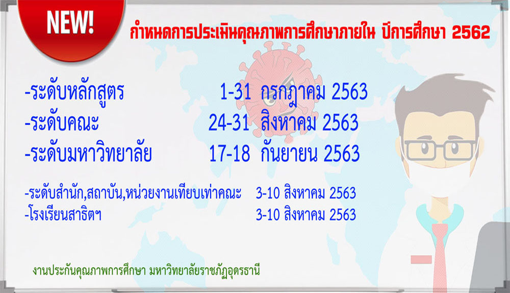 ตามที่เกิดวิกฤตการณ์โรคระบาดไวรัสโคโน่า 2019 หรือ COVID 19 เพื่อเป็นการป้องกันการระบาดของโรค จึงได้เลื่อนการประเมินคุณภาพการศึกษาภายใน ปีการศึกษา 2562 ทุกระดับออกไป เริ่มตั้งแต่ระดับหลักสูตรเดิมกำหนดประเมินระหว่างวันที่ 1-20 พฤษภาคม 2563 เลื่อนไปเป็นวันที่ 1-31 กรกฏาคม 2563 ส่งผลให้ระดับอื่นๆ ต้องเลื่อนตามลำดับเนื่องจากมีความเกี่ยวข้องกันในผลของการประเมิน.