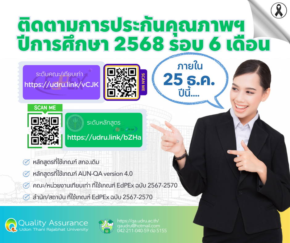 การติดตามผลการดำเนินงานประกันคุณภาพการศึกษา เป็นหนึ่งในระบบและกลไกการประกันคุณภาพการศึกษา ที่มหาวิทยาลัยดำเนินการเป็นประจำและต่อเนื่องทุกๆ ปีการศึกษา เพื่อตรวจสอบคุณภาพการศึกษา เพื่อความเชื่อมั่นต่อบัณฑิตของมหาวิทยาลัย เดือนพฤศจิกายน ครึ่งทางของปีการศึกษา 2568 งานประกันคุณภาพการศึกษา ขอให้หน่วยงานทั้งระดับหลักสูตรที่ใช้ระบบประกันคุณภาพการศึกษาตามเกณฑ์ IQA หรือ เกณฑ์ AUN-QA ระดับคณะ/หน่วยงานเทียบเท่าคณะ ที่ใช้ระบบประกันคุณภาพการศึกษา ตามเกณฑ์ EdPEx รายงานผลการดำเนินงานการประกันคุณภาพการศึกษาภายใน ปีการศึกษา 2568 รอบ 6 เดือน (ระหว่าง 1 มิถุนายน 2568 ถึง 30 พฤศจิกายน 2568) ภายในวันที่ 25 ธ.ค. 68 รายละเอียดช่องทางติดตาม ดังนี้