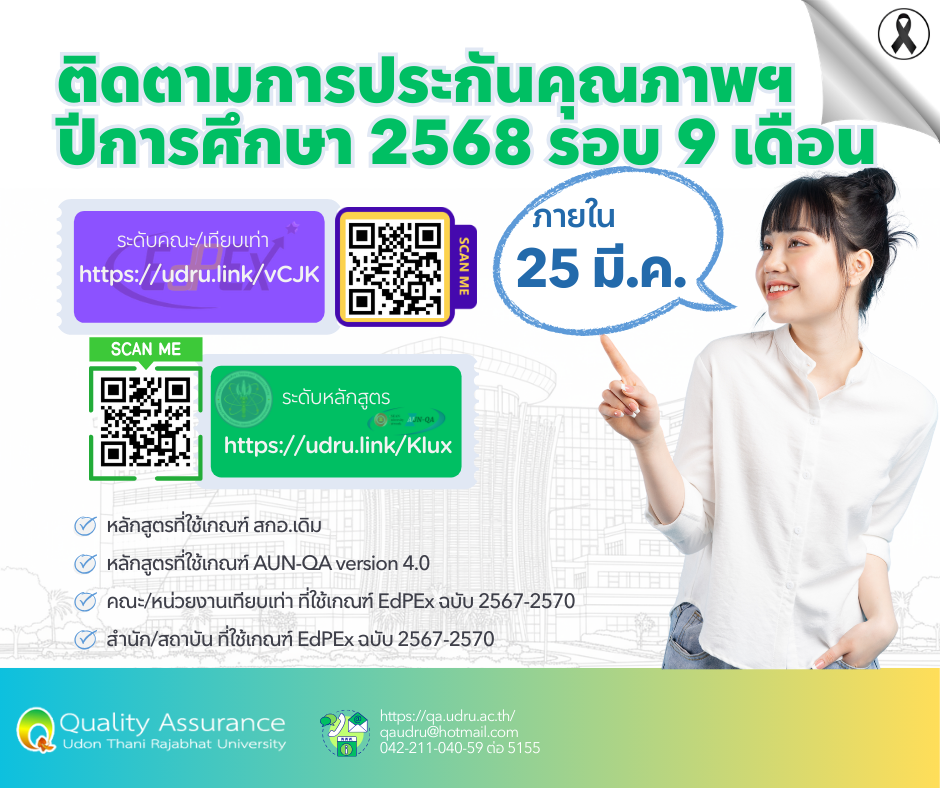 การติดตามผลการดำเนินงานประกันคุณภาพการศึกษา เป็นหนึ่งในระบบและกลไกการประกันคุณภาพการศึกษา ที่มหาวิทยาลัยดำเนินการเป็นประจำและต่อเนื่องทุกๆ ปีการศึกษา เพื่อตรวจสอบคุณภาพการศึกษา เพื่อความเชื่อมั่นต่อบัณฑิตของมหาวิทยาลัย ปีการศึกษา 2568 งานประกันคุณภาพการศึกษา ขอให้หน่วยงานทั้งระดับหลักสูตรที่ใช้ระบบประกันคุณภาพการศึกษาตามเกณฑ์ IQA หรือ เกณฑ์ AUN-QA ระดับคณะ/หน่วยงานเทียบเท่าคณะ ที่ใช้ระบบประกันคุณภาพการศึกษา ตามเกณฑ์ EdPEx รายงานผลการดำเนินงานการประกันคุณภาพการศึกษาภายใน ปีการศึกษา 2568 รอบ 9 เดือน (ระหว่าง 1 มิถุนายน 2568 ถึง 28 กุมภาพันธ์ 2569) ภายในวันที่ 25 มีนาคม 2569 รายละเอียดช่องทางติดตาม ดังนี้